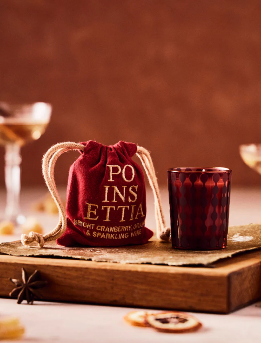 Sweetly refreshing, fruit-forward effervescence, and wrapped in Christmas red. Winter holiday parties are incomplete without a vibrant Poinsettia cocktail. Create new memories and share the merry with inviting aromas of bright cranberry, orange, and sparkling wine. Our 2.5oz candle comes in an embroidered bag.