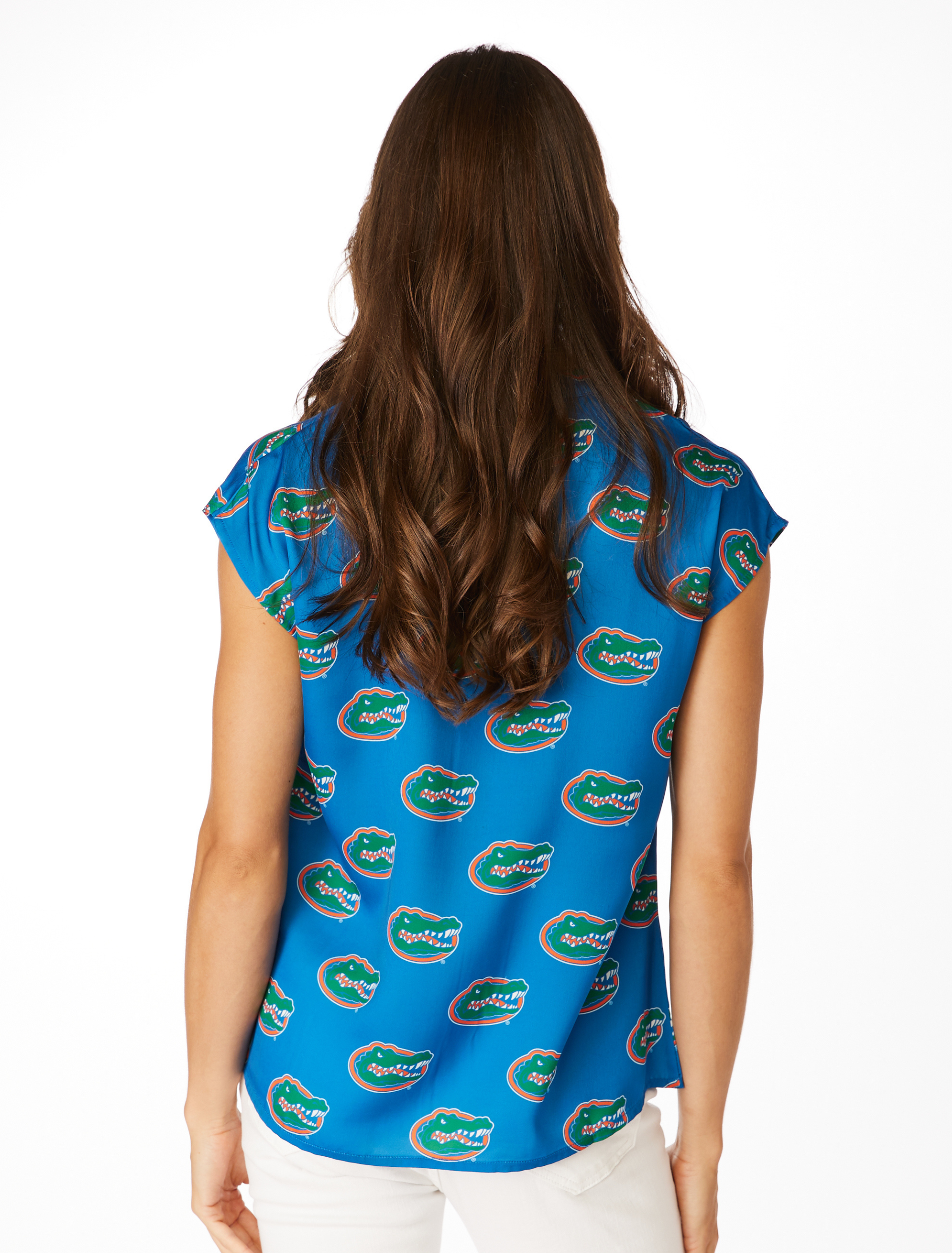 The Gator V-Neck Blouse is a stylish and comfortable choice for game day or any casual outing. Crafted from 100% polyester, this blouse features a flattering V-neck collar and capped sleeves, making it a versatile addition to your wardrobe. Its classic fit ensures comfort and ease of movement.