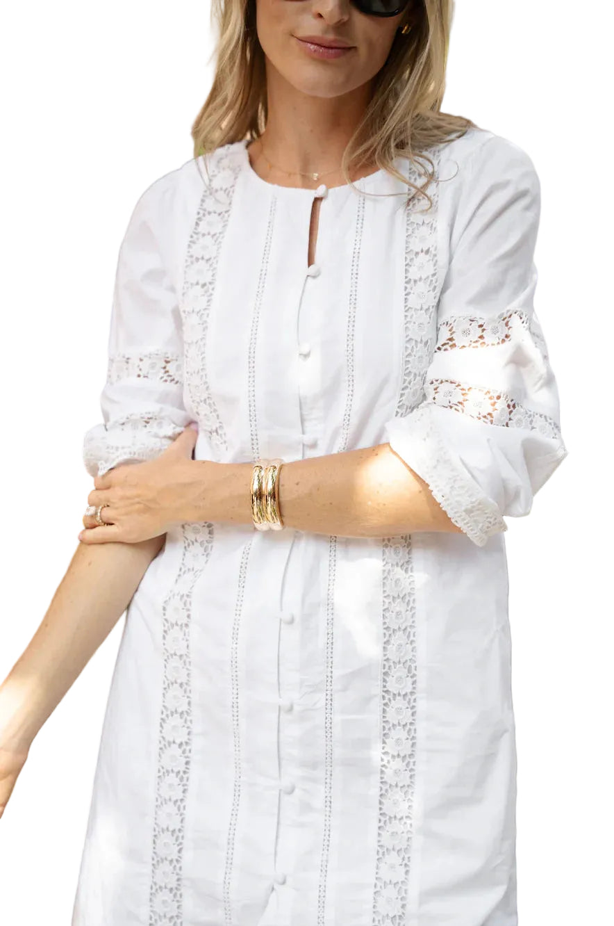 A brand new silhouette for spring! Meet the Button Front Shift. Featuring a delicate cotton lace fabrication, and coordinating fabric covered buttons, this blouson sleeve shift dress is lined and the ideal option for the office or the weekend. It will be your absolute go-to for seasons to come!