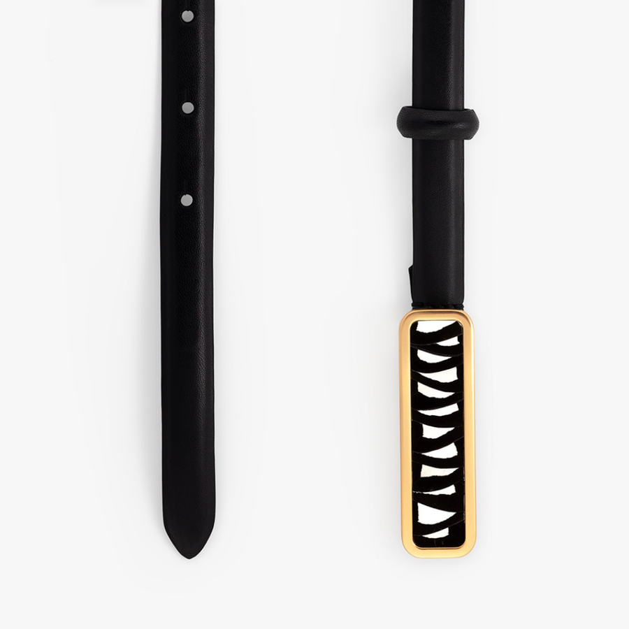 Discover the ACE Basin Abby Belt, a luxurious accessory crafted with precision and style. This belt showcases a skinny silhouette made from premium cow leather, featuring a unique hand-laid feather panel that adds a bold touch to its elegant design. The satin brass finished buckle complements the belt's sophisticated look, making it a versatile addition to any wardrobe.