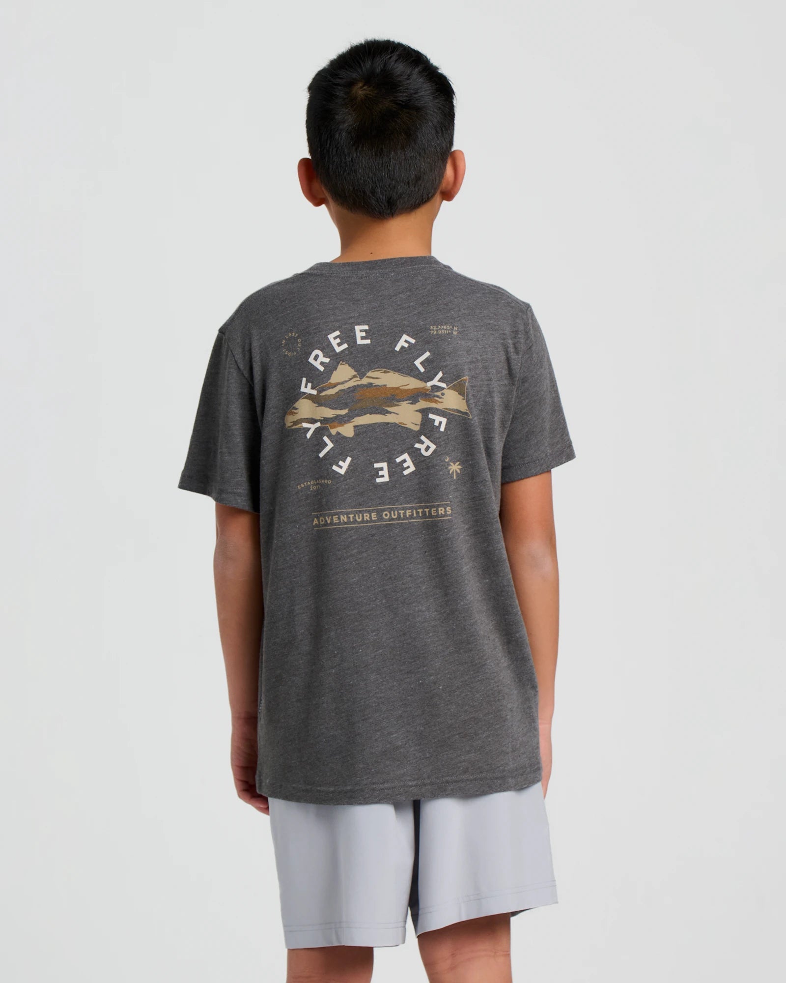 The Youth Camo Redfish Tee offers a blend of comfort and style, featuring a unique camo pattern inspired by local marsh critters. This tee is crafted from an ultra-soft, tri-blend fabric, ensuring a soft and worn-in feel, perfect for active youth.